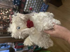 Description:White furry poodle with red bow and googly eyes
