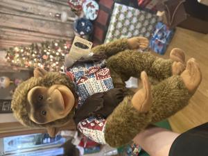 Brown, plush puppet monkey with western shirt and suede fringe vest