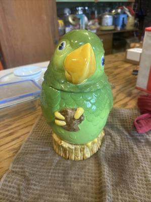 Green parrot cookie jar poppytail mint locks California pottery 1950s