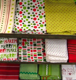 A bevy of fabulous dishcloths for the home; red and green patterns bring a sense of merriment to the kitchen. Buy several for your baked good gifts for the gatherings you'll be attending! Available at Stars Too.