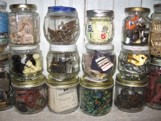 An open bead board wall cupboard gets attention when filled with dozens of jars filled with like items. Dealer #60 has game pieces, hardware, sewing notions, and more in an organized display of recycled jam jars!