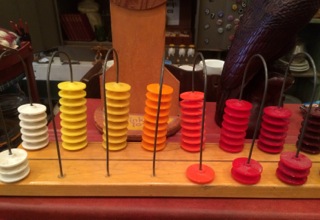Multi colored discs help with elementary mathematics in this tabletop abacus at Stars Too.