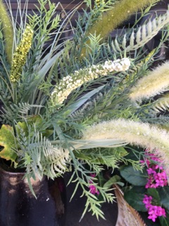 Mixed greens stand out against each other with a single burst of color in this arrangement outside Stars Too.